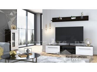 Тумба Милан ТБ-11 состоит из навесной полки и тумбы под ТВ с открытыми полками и двумя секциями, скрытыми откидывающимися вниз МДФ-створками.