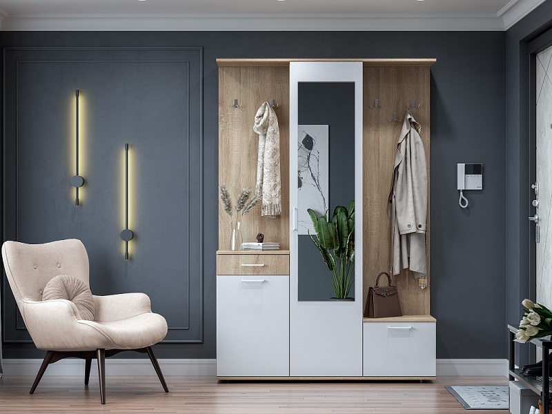 Слева находится тумба высотой 786 мм с выдвижным ящиком и секцией с 2 съемными полками за распашной створкой. Сверху расположен щит высотой 1168 мм с крючками. Посередине пенал шириной 450 мм, внутри которого 5 съемных полок. На его распашной двери зеркало размером 350х1350 мм. Справа обувница высотой 370 мм за распашной створкой и щит высотой 1584 мм с 3 крючками. Все элементы скреплены общей крышей.