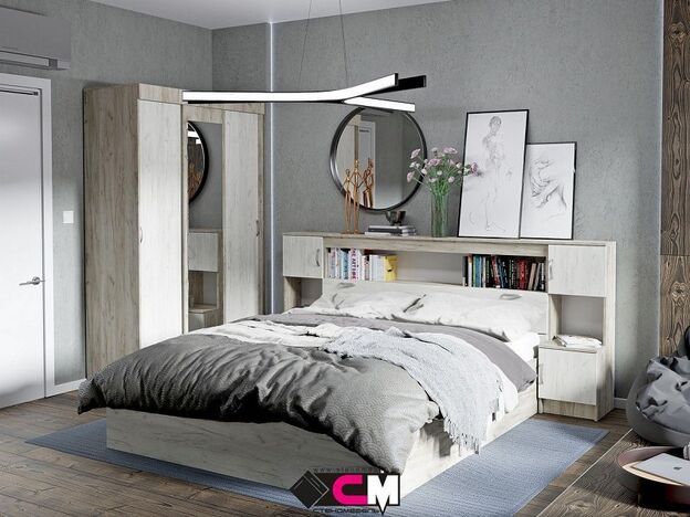 Кровать с прикроватным блоком 1600 Басса КР-552 дуб крафт серый-дуб крафт белый ШхВхГ 2352х1016х2232 мм - 1 шт.